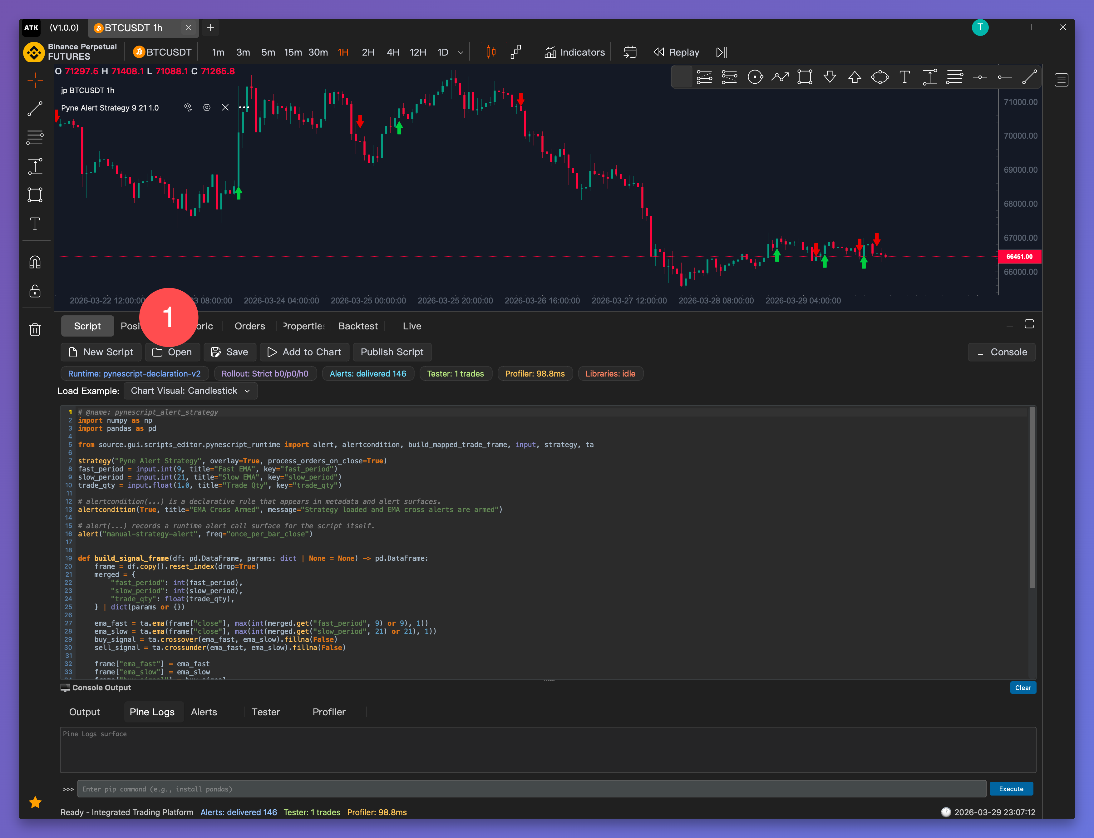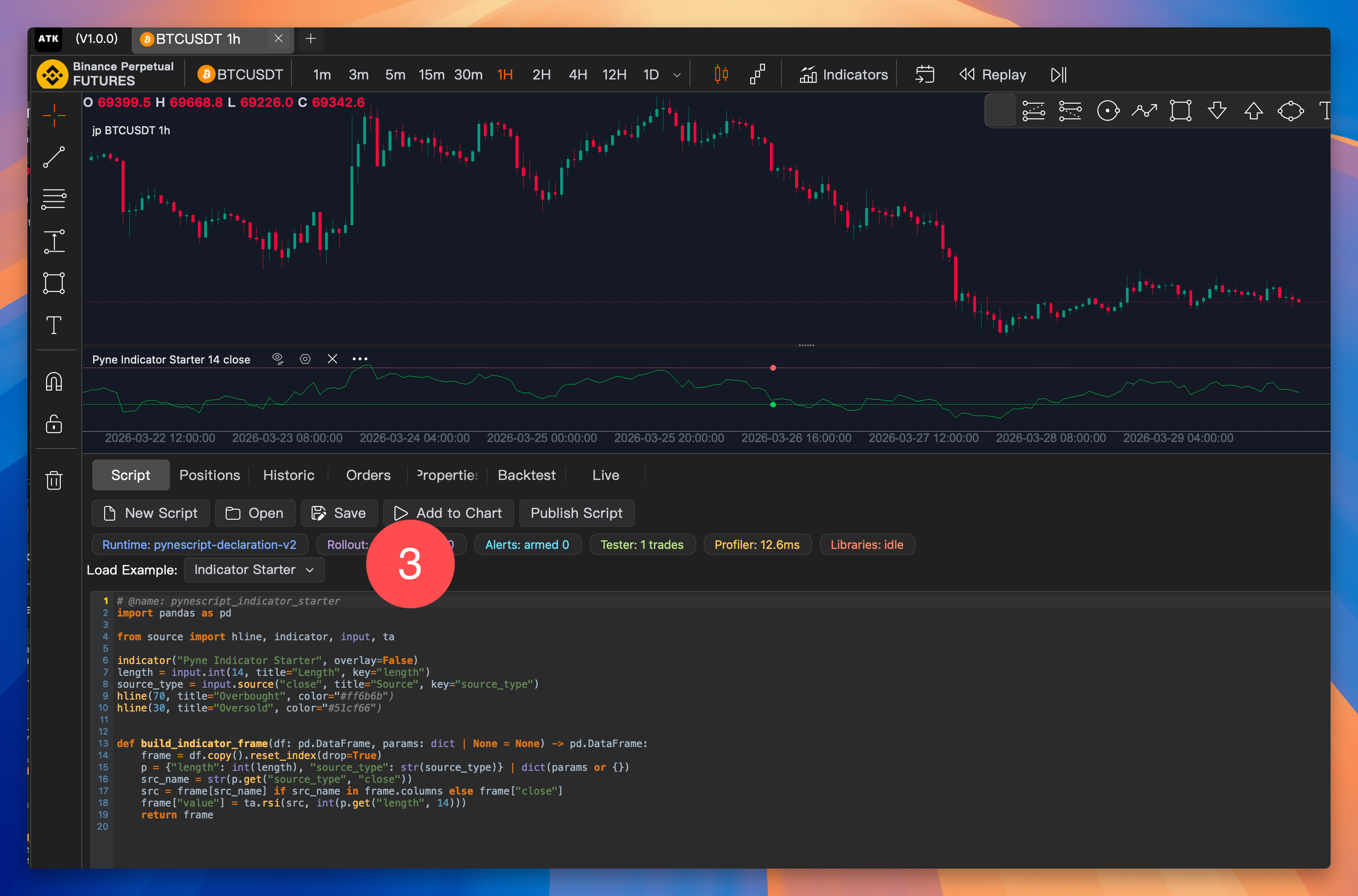PyneScript V6 is a Python-based scripting language designed for algorithmic trading on the ATK platform. It provides a familiar Python syntax with built-in support for technical analysis, strategy backtesting, and rich chart visualizations.