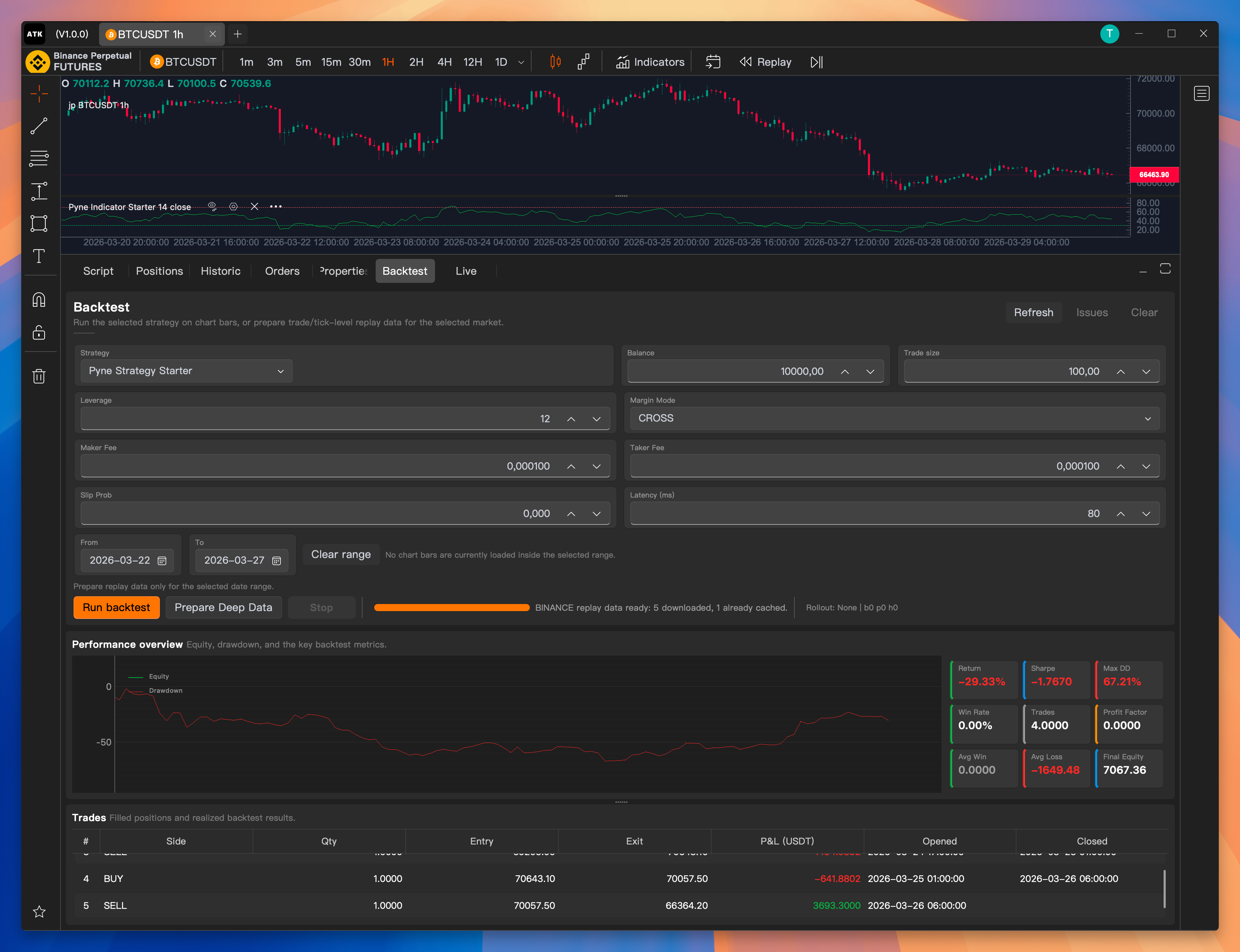 ta.*namespace with EMA, RSI, MACD, Bollinger Bands, and more - Strategy backtesting — Full execution realism with slippage, commission, and order fill simulation